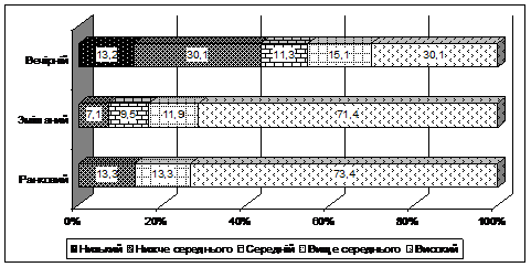 В даній віковій групі первинні порушення в діяльності серцево-судинної системи (індекс Робінсона) виявлені у осіб з вечірнім та аритмічними хронотипами. У осіб ранкового хронотипу показник даного індексу складав 81,73 ± 6,25 ум.од., у осіб аритмічного хронотипу ¾ 91,29 ± 3,80 ум.ом. та у осіб вечірнього хронотипу ¾ 90,96 ± 2,47 ум.од. «Високий» та «середній» показники діяльності серцево-судинної системи (індекс Робінсона) властиві для 30 % та 47 % осіб відповідно у групі з вечірнім хронотипом, у 21 % та 41 % відповідно з аритімчним та 7 % та 40 % відповідно з ранковим хронотипами (Рис. 2). При чому, в даній групі виявлено достовірний зсув індексу Робінсона за критерієм Gamma (g) в бік вечірнього хронотипу (р ≤ 0,05).