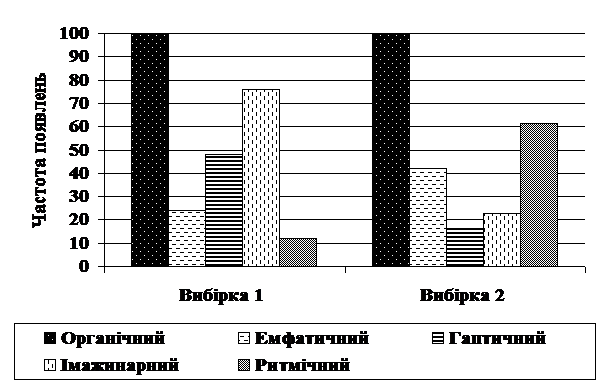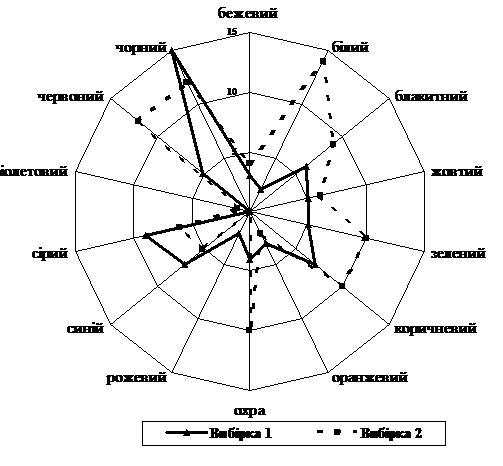 Проаналізувавши кольорову гаму, яку обирав майстер для своїх творів, ми також побачили відмінності у двох вибірках. Так, у першій групі картин найчастіше зустрічаються чорний (15; кореляція з емоціями страху, гніву, втоми та суму), синій і блакитний (13, кореляція з емоціями суму та інтересу), сірий (9; кореляція з емоціями втоми та суму), коричневий (7; кореляція з емоціями відрази та втоми) кольори. Найрідше в першій вибірці зустрічалися світлі кольори – бежевий (3), білий (2) та рожевий (2). У творах другої групи найбільш розповсюдженим виявилися жовтий та охра (16; кореляція з емоціями здивування, радості та інтересу), білий (14), червоний (12; кореляція з емоціями радості та гніву), зелений (10; кореляція з емоціями інтересу та здивування) кольори. Разом із цим, не рідше зустрічалися і темні кольори: чорний (12), коричневий (10), блакитний (9), сірий (6) [див. табл. 2, рис. 2].